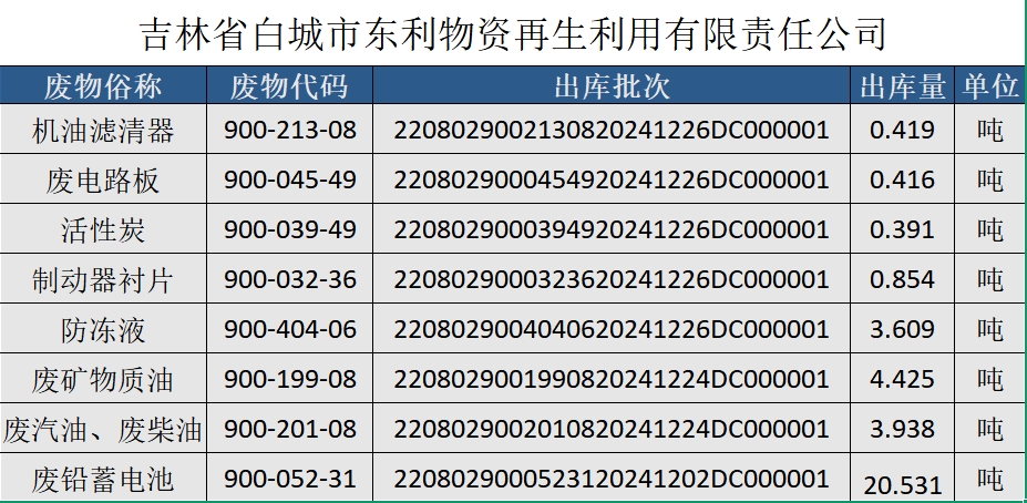2024年吉林省白城市东利物资再生利用有限责任公司危险废物转移信息公告